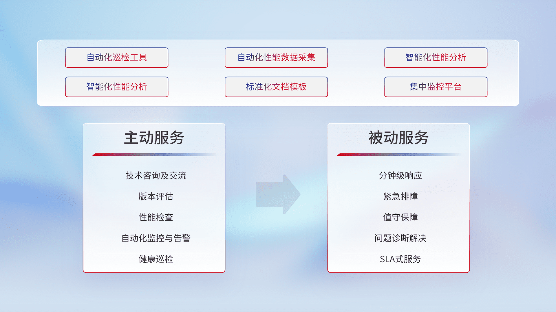 智能化工具和标准化文档,,保障服务质量,,,,提供主动服务(包含技术咨询、、、、版本评估、、性能检查、、、、自动化监控与告警、、、、健康巡检)和被动服务包含(分钟级响应、、、紧急排障、、、值守保障、、、问题诊断解决、、、SLA服务)。。。